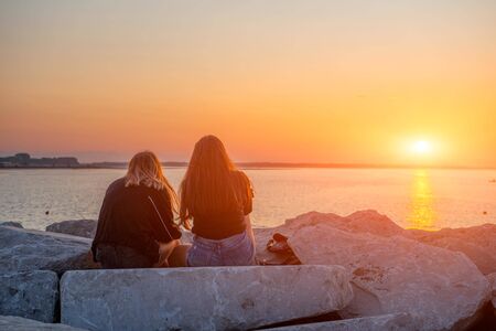 Pathos, Cyprus - May 19, 2016 - Young couple sits on beach and enjoys the sunset