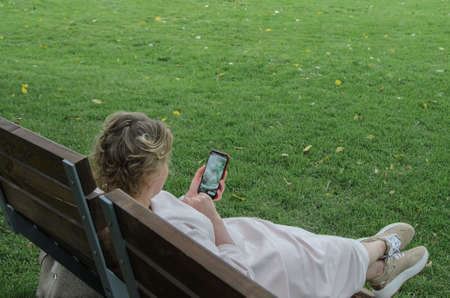 A woman in a pink loose dress and sneakers is resting on a wooden deck chair in the park. Woman with the phone relaxes on the green lawn in the park. The concept of recreation in the city. Space for text.