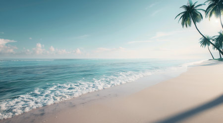 Experience the calm beauty of a tropical beach with palm trees and serene ocean waves. This tranquil setting invites relaxation and escape into nature.