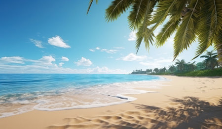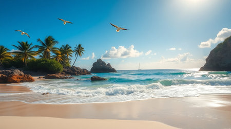 Golden sand stretches along the shore, where gentle waves lap at the beach. Palm trees sway in the warm breeze under a clear blue sky, creating a serene tropical atmosphere.