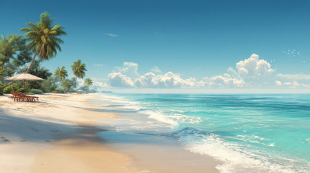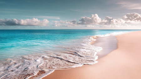 Art beach scene with gentle waves, sandy shoreline. Bright colors create peaceful atmosphere. Generated AI. Sunny beach holidays travel concept. Copy space. Sunny tropic paradise. Plage background.