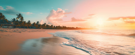 Illustration of a tropical beach at sunrise, with gentle waves lapping at the shore and palm trees swaying in the breeze. The soft pastel colors in the sky reflect the early light, giving the scene a dreamy, relaxing feel.