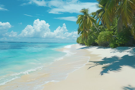 Breathtaking view of pristine white sand beach in Maldives. Turquoise waters of Indian Ocean lap gently at shore, creating serene idyllic scene. Sky is vibrant blue, dotted with fluffy white clouds