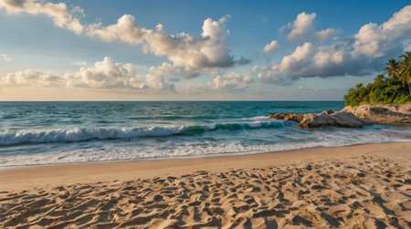 Captivating view of a peaceful tropical beach where gentle waves kiss the warm sand under a clear blue sky adorned with fluffy clouds.