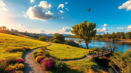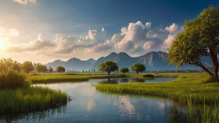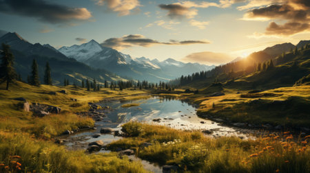 a breathtaking scenery landscape featuring majestic mountains basking in the warm glow of the sun. this photo captures the essence of a playstation 5 screenshot, with impressionist-landscapes and photo-realistic details. the 32k uhd resolution brings out the beauty of the minimalistic serenity, creating a cabincore vibe that could easily grace the pages of national geographic. ai generated