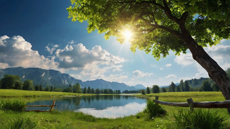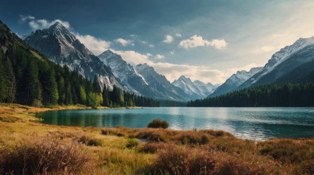 Generative AI : Amazingly beautiful summertime landscape with a mountain lake with emerald water surrounded by coniferous forests and majestic mountains
