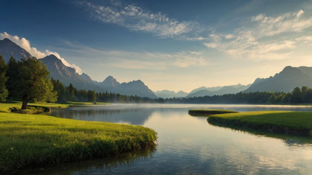 Beautiful landscape with lake and mountains in the morning. Landscape with lake and mountains.
