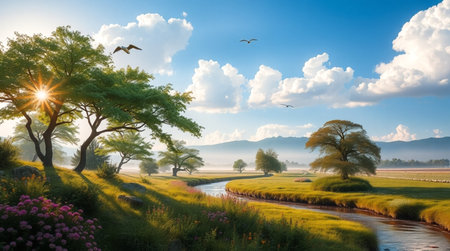 a rocky creek winds its way through the desert, creating a serene pastoral scene reminiscent of ivan shishkin's artwork. this national geographic photo captures the beauty of mountainous vistas and showcases the american tonalist style. the sun's rays shine upon the creek, adding a touch of enchantment with lens flare. ai generated