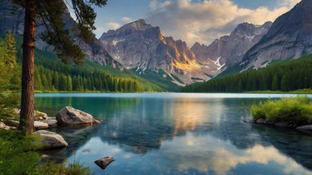A breathtaking view of a tranquil lake at sunrise, with majestic mountains in the background reflecting on the calm waters, creating a serene and picturesque landscape.