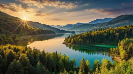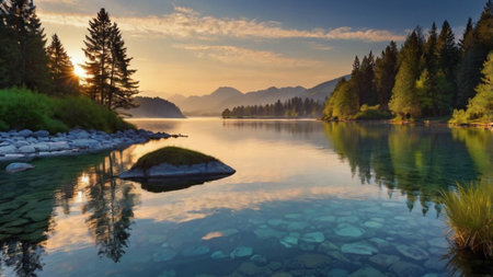 A beautiful sunrise casts golden hues over a tranquil lake, surrounded by majestic mountains and dense green forests. The mist rises gently from the water's surface, creating a peaceful atmosphere.