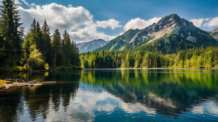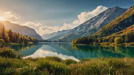 Panoramic view of idyllic alpine lake in summer