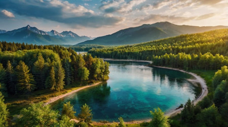 Mountain lake in the mountains at sunset. Beautiful summer landscape.