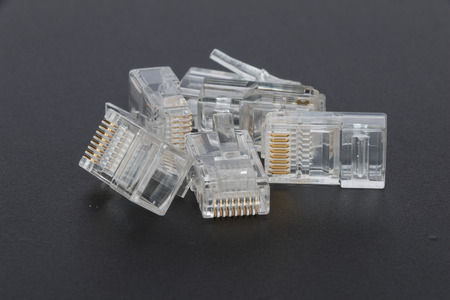 Blank RJ45 Ethernet plugs on a black background