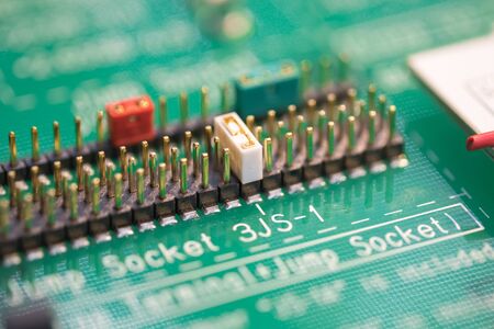 Closeup shot image of electronic circuit board. Shallow depth of field and selective focus. noise and grain due low light