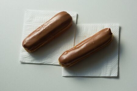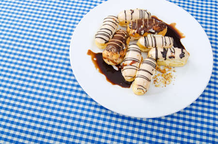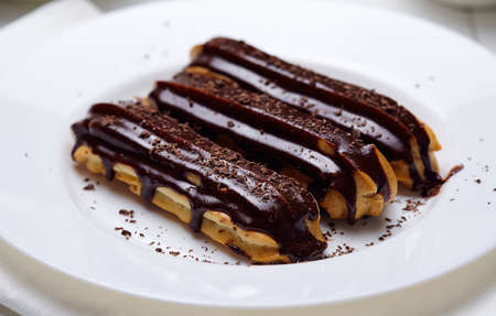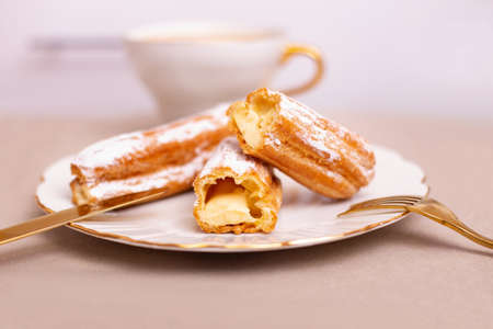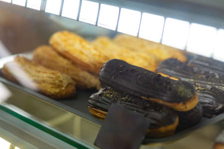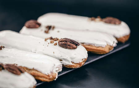 French sweet dessert filled with cream fresh baked eclers cakes close up