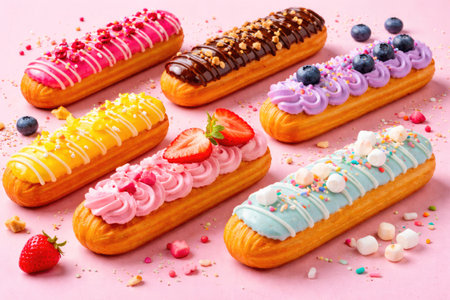 Vibrant array of eclairs with various toppings and flavors, perfect for dessert.