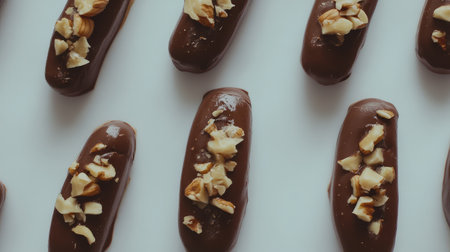 Frozen banana slices dipped in chocolate and topped with nuts, arranged on a light background