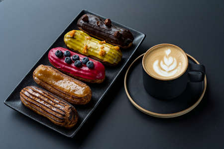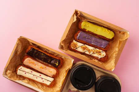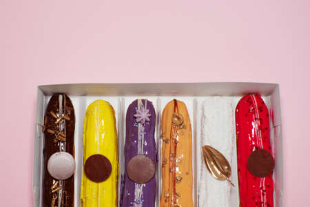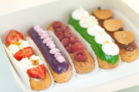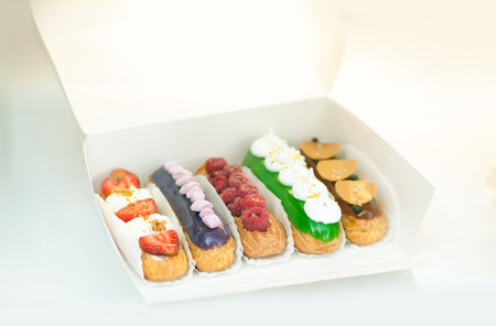 set of eclair cakes with different fillings in a box close up traditional french dessert