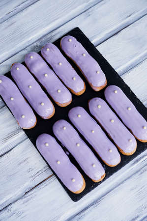 Traditional French dessert. Sweet and colorful eclairs with chocolate glaze.