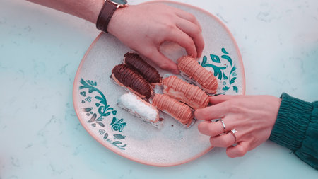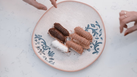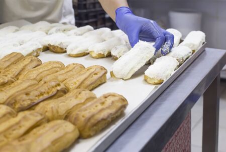 Confectionery for the production of desserts and sweets, making custard cake eclairs with cream and coconut