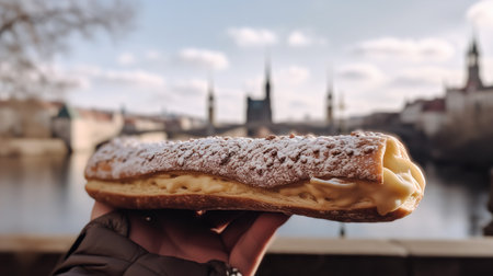 Traditional Czech trdelnÃk, a kind of spit cake, freshly baked and dusted with sugar, with the Prague Castle and Charles Bridge in the backdrop.