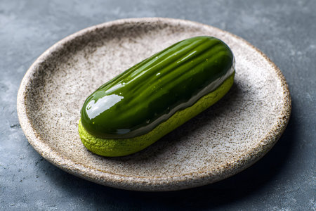 A beautifully crafted green matcha eclair sits on a simple plate. It features layers of vibrant green frosting and a smooth texture, illuminated by soft afternoon light.