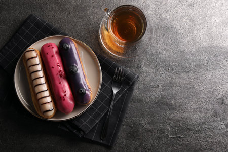 Different tasty glazed eclairs served with tea on gray textured table, flat lay. Space for text