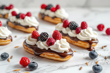 Fruit and Berry Eclair Cakes, Delicious Fruits Milk Dessert, Chocolate Mirror Glazed Eclairs, Copy Space, Generative AI Illustration
