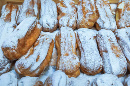 Close-up of Eclair cakes from custard dough sprinkled with powdered sugar. Horizontal orientation, selective focus.