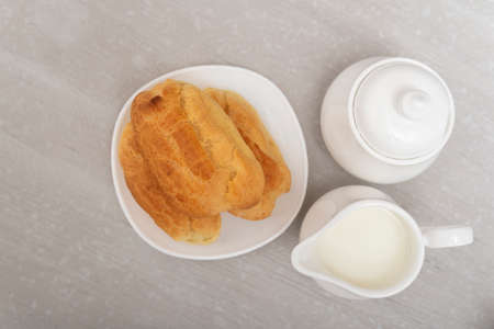 Homemade cakes on saucer next to jug of milk top view. Eclairs, profiteroles