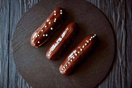 Delicious eclairs, on a dark plate on a dark background. Space for copying. Sweets