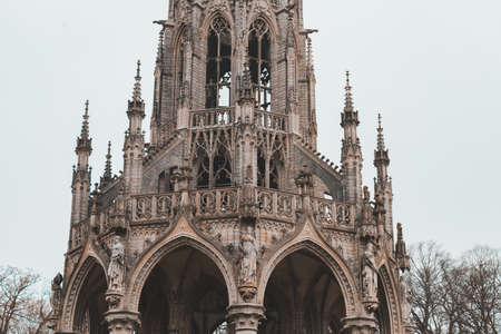 The monument of the King Leopold I in Laeken park in Brussels. Facade of old church under blue sky