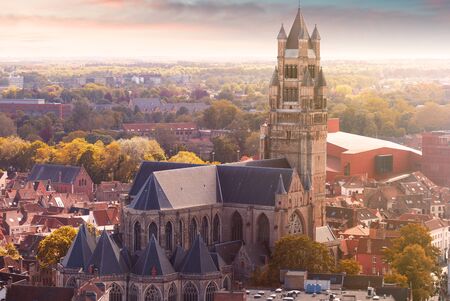 Panoramic aerial view of the old autumn city of Bruges from the viewing platform of the Belfort tower at sunset with a view of the Cathedral of St. Salvator, Belgium. Nice autumn colors