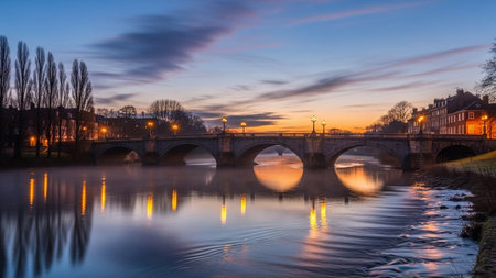 Sunset view of the old bridge over the river Elbe in Regensburg, Germany