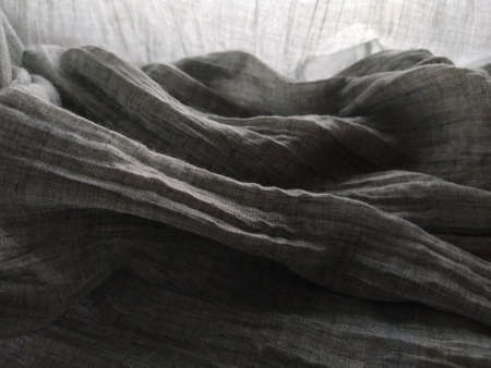 Light translucent curtains or tulle in the Scandinavian style. Gray pleated fabric or wrinkled textile hangs down. Close-up. The bottom edge of the curtain lies on a horizontal surface. Soft focus.