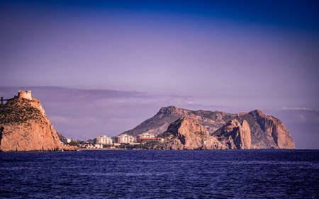 Spanish coastal landscpae with castle San Juan on cliff, Aguilas, Murcia region, Spain.