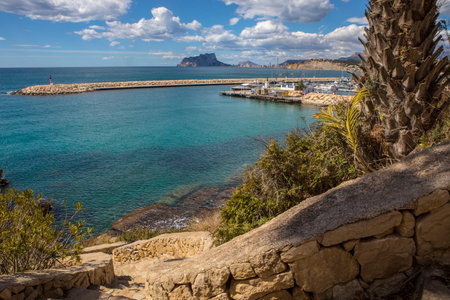 A view over the harbour in the coastal town of Moraira in Spain. Calpe Rock and the town of Calpe is in the distance.