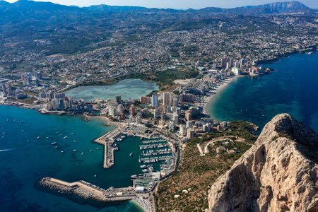 View over Calpe (Calp) town, Spain. Shot from the Penon ( Ifach) rock, overlooking the coast, the harbor and Sierra de Bernia mountains