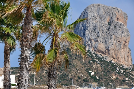 Calp Spain palm trees and rock landmark of Penyal d`Ifach