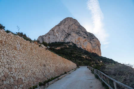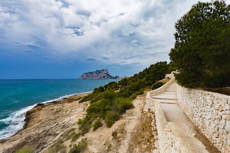 Path up to the Peñón de Ifach Natural Park in the city of Calpe, Valencia, Valencian Community. Spain. Mediterranean sea. Cantal Roig Beach, La Fossa Beach and Las Salinas