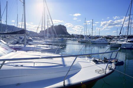 Coastline of the Mediterranean resort of Calpe, Spain with sea and yachts, lake, skyscrapers and mountain range