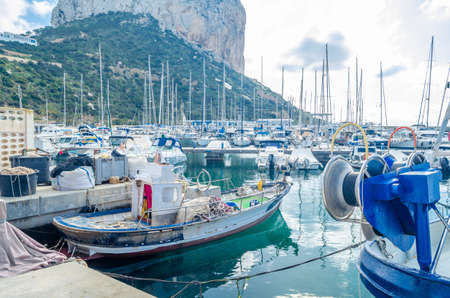 CALPE, SPAIN - JANUARY 26, 2022: View of the fishing port of Calpe, with the Peñon de Ifach in the background, Alicante province, Valencian Community, Spain