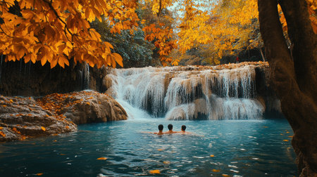 Experience the serene beauty of an autumn waterfall scene at Huai Mae Khamin. This tranquil setting invites relaxation amid vibrant foliage and crystal-clear waters.
