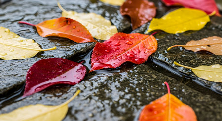 A Colorful autumn leaves with raindrops create vibrant, textured pattern