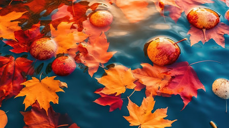 Vivid autumn leaves float gracefully on a tranquil pond surface, reflecting a vibrant display of colors. The water remains solid, creating a peaceful atmosphere filled with nature's beauty.