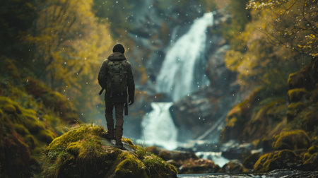 Adventure traveler in awe of majestic waterfall scenery with towering rock boulder in wilderness nature setting