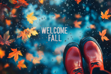 Red rain boots with autumn leaves and text Welcome Fall in the background, AI Generated