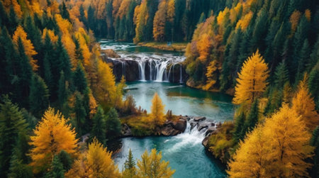 Aerial view of beautiful waterfall in autumn forest. Beautiful nature landscape.