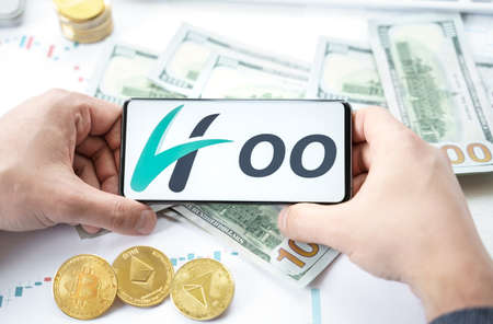 Russia Moscow 20.05.2021 Hoo logo in mobile phone.Cryptocurrency decentralized exchange DEX.Trading blockchain platform.Swap,buy,sell crypto token,digital coin Bitcoin,Ethereum.Business.