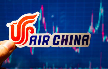 November 10, 2021 Beijing, China. The emblem of the Air China airline against the background of a stock price chart.